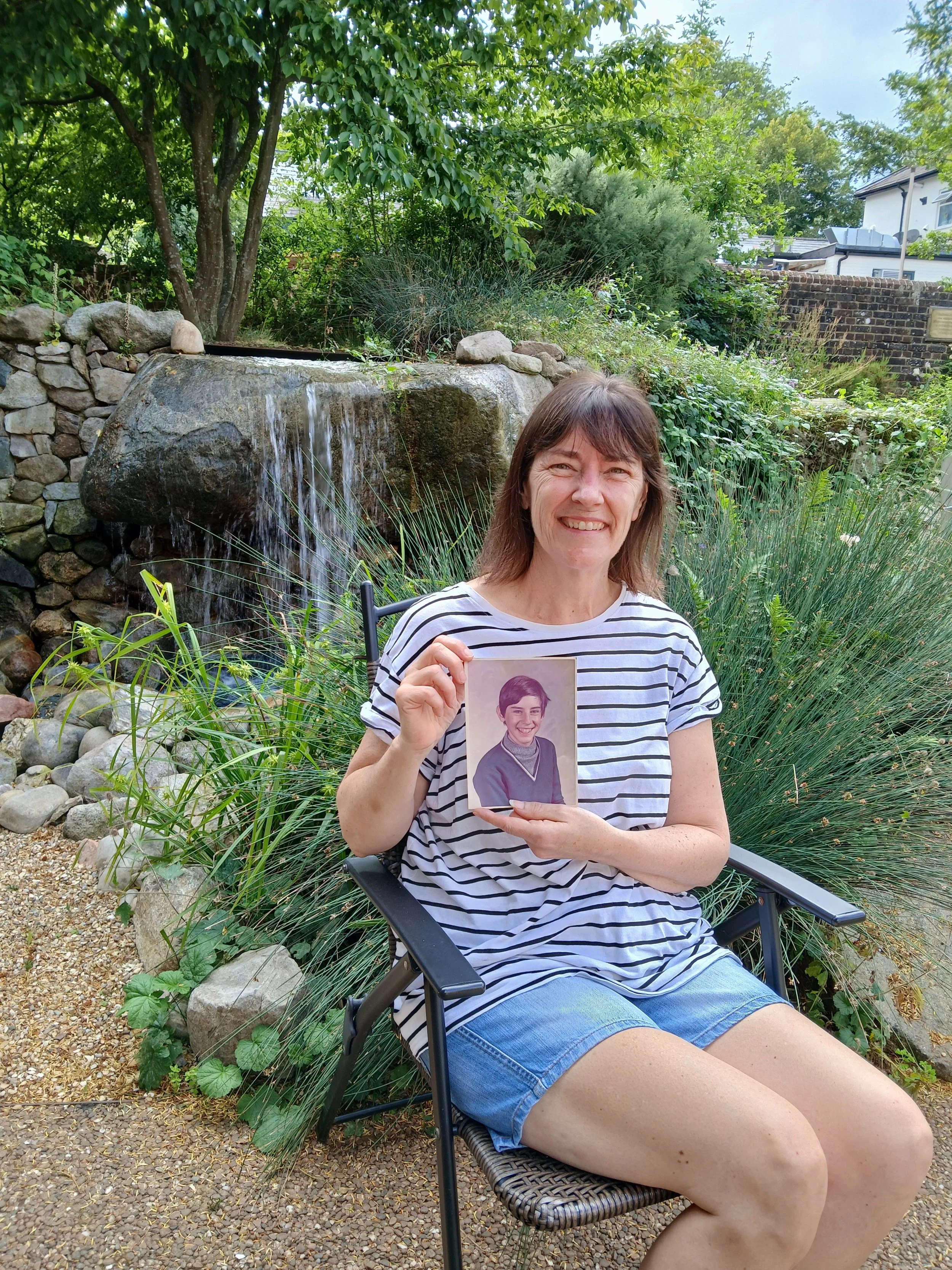 Donna holding a picture of her brother Dudley in the hospice garden